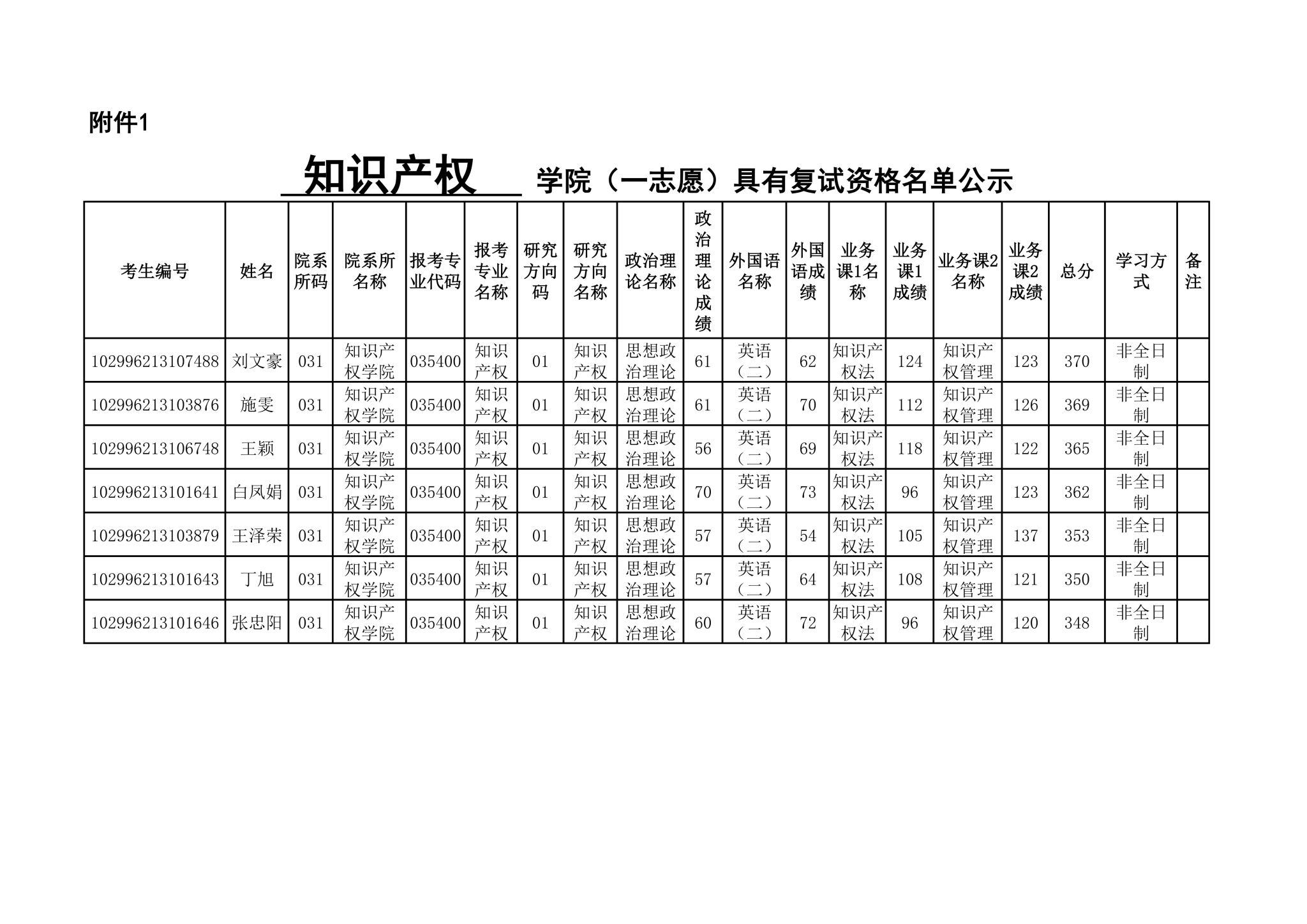 知识产权学院(一志愿)具有复试资格名单公示(非全日制)