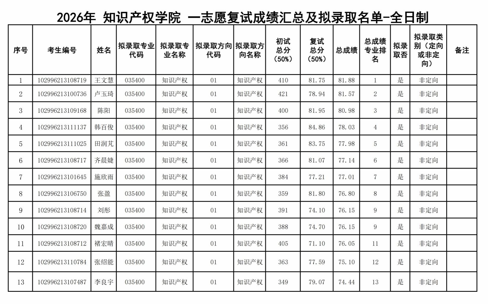 上一条:2026年知识产权学院一志愿复试成绩汇总及拟录取名单(非全日制)