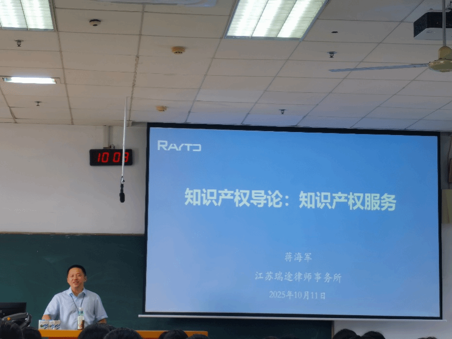 为激发学生专业兴趣,增强职业认同感,10月11日,学院开展“行业专家进课堂”活动,邀请江苏省知识产权领军人才、江苏瑞途律师事务所蒋海军律师为知识产权专业2025级新生授课。