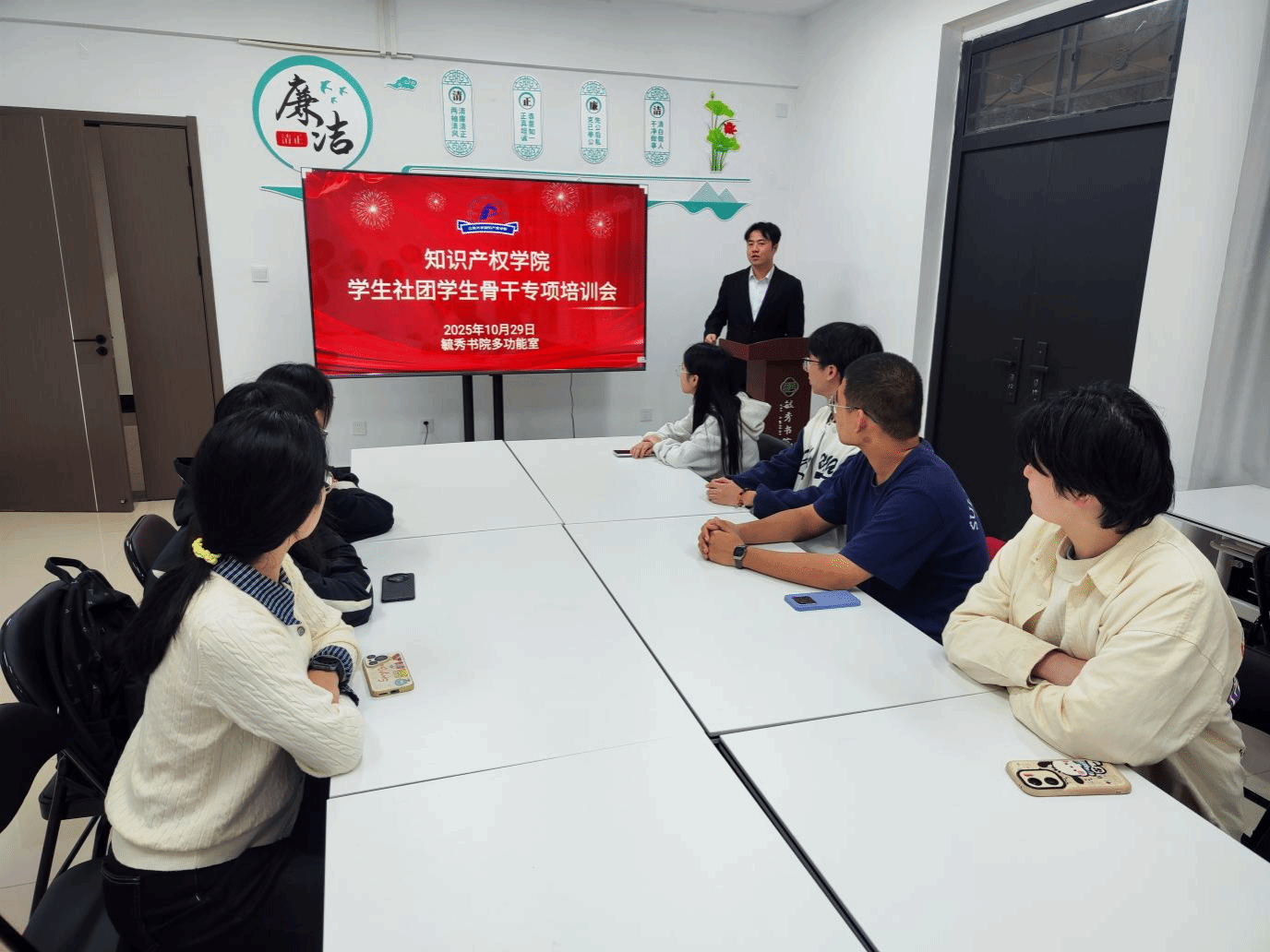 为落实学校学生社团规范管理要求,履行业务单位主体责任,10月29日,知识产权学院指导的知识产权服务协会在毓秀书院多功能室召开 2025 年秋季学期学生骨干专项培训会。学院申梦昊老师(社团指导老师)、社团负责人及骨干成员参会。